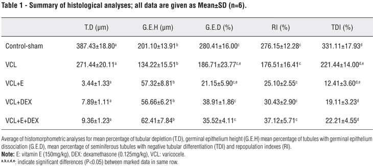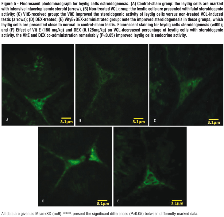 Comparing the isolated and simultaneous form of administration revealed that the simultaneous administration of DEX and VitE exerted better results for enzymatic and non-enzymatic antioxidant defense lines and showed significantly higher levels of testosterone. This situation suggests the necessity of the VitE with DEX co-administration in order to inhibit the VCL induced damages.