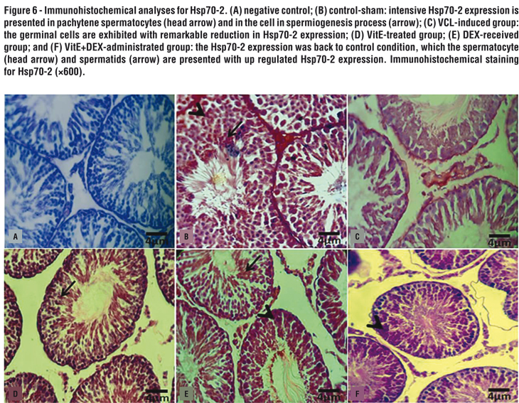 In light of these findings and considering the regulatory role of Hsp70-2 in spermatogenesis, the current study was undertaken to evaluate whether the co-administration of Dexamethasone (DEX), as anti-inflammatory agent, and vitamin E (VitE), as potent antioxidant, could prevent the VCL-induced damages in testicular tissue. For this purpose the testicular tissue total antioxidant capacity (TAC), tissue malondialdehyde (MDA) content, biochemical changes of superoxide dismutase (SOD), glutathione peroxidase (GSH-Px) in testicular tissue, the nitric oxide (NO), the histological features for germinal cells RNA damage, Leydig cells bioesteroid activities and sperm parameters were analyzed. Moreover, the protective effect of VitE and DEX on VCL-induced alterations in Hsp70-2 chaperone expression was evaluated as well. Moreover, this study was aimed to uncover their protective effect on sperm parameters.