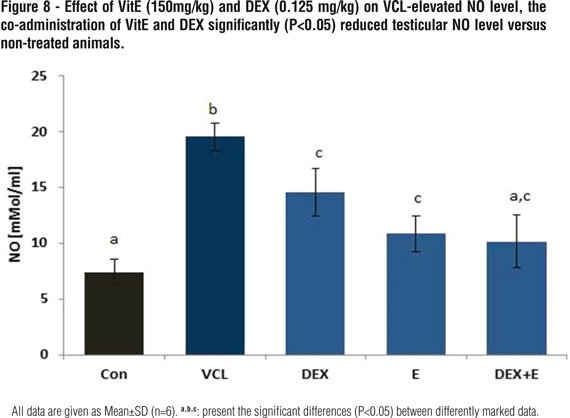 Biochemical observations demonstrated that VCL resulted in severe elevating of NO in testicular tissue versus control-sham group. Meanwhile, the treated animals exhibited significantly (P<0.05) reduced levels of NO in testicular tissue. Accordingly, the animals in DEX+Vit E-simultaneous-administrated group showed the lowest NO content compared to DEX and VitE alone-administrated animals (Figure-8).