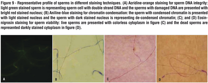 In order to evaluate the DNA double strand breaks the acridine orange staining kit (Poly Scientific R &D Crop, New York, USA) was used and analyzed by Epi-fluorescent microscope (Model GS7, Nikon co., Japan). The sperms with red and/or yellow fluorescent stained nucleus were considered as sperms with single strand DNA and the sperms with light green stained nucleus were marked as sperms with double strand DNA. The percentages of sperms with double strand DNA were reported.