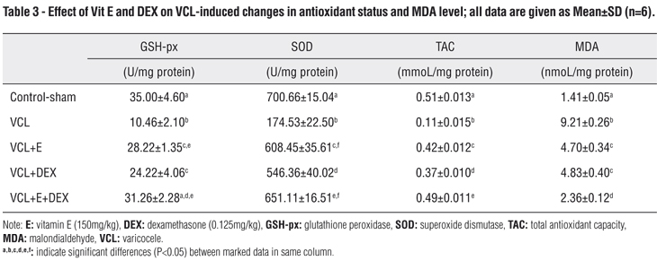 The testicular levels of TAC, GSH-px and SOD were measured in different groups. The non-treated VCL group presented significant (P<0.05) decrease in testicular TAC, GSH-px and SOD levels in comparison to control-sham animals. While the DEX and VitE-administrated groups remarkably up-regulated the GSH-px and SOD contents associated with testicular TAC level. Moreover, the DEX+VitE-administration significantly (P<0.05) declined the VCL-elevated MDA content (Table-3).
