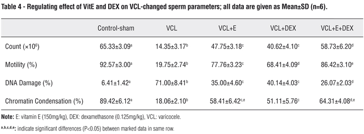 The non-treated VCL-induced animals showed a significant (P<0.05) decrease in sperm count compared to control-sham and treated groups. Fluorescent staining for DNA damage indicated that VCL-induced sperm damage shown in Figure 9-A was significantly ameliorated by DEX and VitE administration (P<0.05). The aniline-blue staining for sperm chromatin condensation revealed that the animals in DEX+VitE-administrated group (76.50±3.41) exhibited significantly (P<0.05) higher percentage of sperms with nuclear maturity in comparison to non-treated VCL-induced (52.75±4.99), DEX alone-administrated (63.00±2.94) and VitE alone-received (66.50±3.06) groups. No changes in sperm count and chromatin condensation were observed in control-sham group (Figure 9-B). The sperm viability remarkably (P<0.05) decreased in non-treated VCL-induced animals, while the co-administration of DEX and VitE elevated the sperm viability after 60 days (Figures 9 C and D). Similar to other sperm parameters, the treated animals illustrated with significant (P<0.05) elevation in sperm motility versus the non-treated ones. The data for sperm parameters are presented in Table-4.