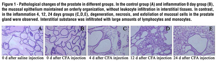 Pathological examination showed thAT CFA treated prostates presented with degeneration, necrosis and exfoliation of mucosal cells in the prostate gland. Infiltration of large amounts of lymphocytes and monocytes was noted in the interstitium, and some lymphocytes aggregated in cluster. In the control group, the mucosal epithelial cells were regularly arranged, and the infiltration of leukocytes was not observed in the interstitium (Figure-1).