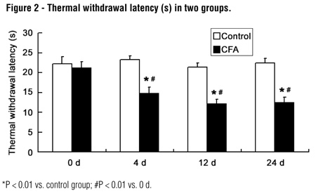 The thermal withdrawal latency (TWL) of the rats was detected at 4 d, 12 d and 24 d after injection respectively. The rats were placed in a box (2 cm x12 cm x 22 cm) with a glass floor and allowed to accommodate to the environment for 30 min. Then, a light spot (5 mm in diameter; 50 W, 12 V) was produced through a radiant heat stimulator and used to stimulate the paw. The time to paw withdraw was recorded as the TWL. The stimulation was done for no longer than 30 s and measurement was performed 5 times in each rat with an interval of 10 min. between two detections. The maximal or minimal TWL was removed, and the TWL in remaining 3 measurements was employed for the calculation of average (16).