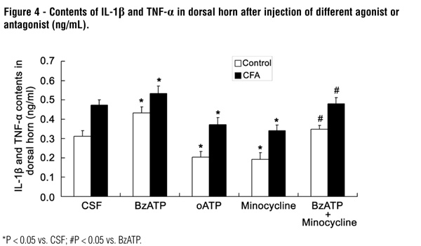 In the experiment group, following injection of minocycline and oATP, the content of TNF-a and IL-1b was markedly reduced (P < 0.01). However, the P2X7 agonist (BzATP) could promote the secretion of TNF-a and IL-1b (P < 0.01 and < 0.05, respectively), and minocycline inhibited the bioeffects of BzATP (P < 0.05). In the control group, intrathecal injection of ASCF had no influence on the contents of TNF-a and IL-1b in the spinal cord (Figure-4).