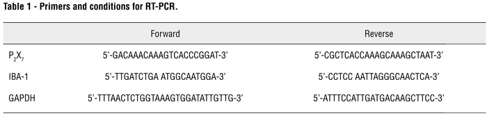 The resulting cDNA (20 ng) was used as templates for real-time fluorescence quantitative (FQ) PCR using a SYBR green PCR core reagent kit (Applied Biosystems, Foster City, CA) in DNA Engine OPTIONTm2 (MJ RESEARCH, USA). The primers were designed using the Geneworks software package as follows: P2X7: 5’-GACAAACAAAGTCACCCGGAT-3’ (forward) and 5’-CGCTCACCAAAGCAAAGCTAAT-3’ (reverse); IBA-1: 5’-TTGATCTGA ATGGCAATGGA-3’ (forward) and 5’-CCTCC AATTAGGGCAACTCA-3’ (reverse). The PCR conditions were as follows: reverse transcription at 50º C for 30 min., Hot Start Taq (1.25 unit/sample) activation for 15 min at 95º C, 40 cycles of denaturation at 94º C for 15 s, annealing at 56º C for 30 s, and extension at 72º C for 30 s. The SYBR Green fluorescence was acquired by a final extension at 79º C. The melting curve analysis was performed after each reaction. GAPDH (5’-TTTAACTCTGGTAAAGTGGATATTGTTG-3’ [forward] and 5’-ATTTCCATTGATGACAA GCTTCC-3’) served as an internal control (Table-1). The expression of target genes could be calculated according to the amplification standard curve and regression equation of GAPDH automatically by the DNA Engine OPTIONTm2. The expression of target genes was normalized to that of GAPDH as the relative expression. Average was obtained from 6 animals in each group.