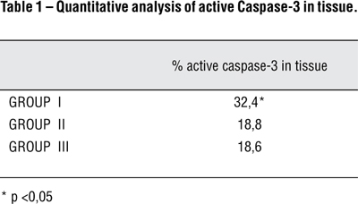 The statistical analyses showed that the volumetric density of active caspase-3 was greater in the orchiectomized group without alpha-tocopherol supplementation (32.4%) than in the other groups (group II, 18.8%; group III, 18.6%) (p = 0.007). In addition, there was no statistically significant difference between the group that received alpha-tocopherol supplementation before orchiectomy and the group that received it both before and after orchiectomy (p = 0.55) (table 1).