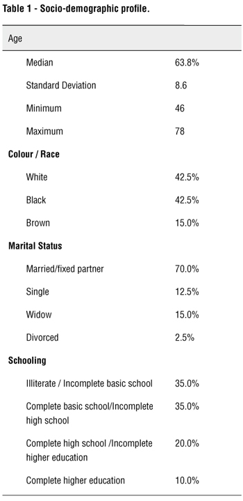 Socio-demographic characteristics of the 40 patients are described in Table-1. Median age was 63.8 ± 8.6 years, varying from 46 to 78 years, and 70% of patients were married or had a fixed partner.