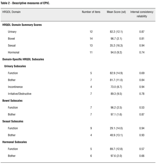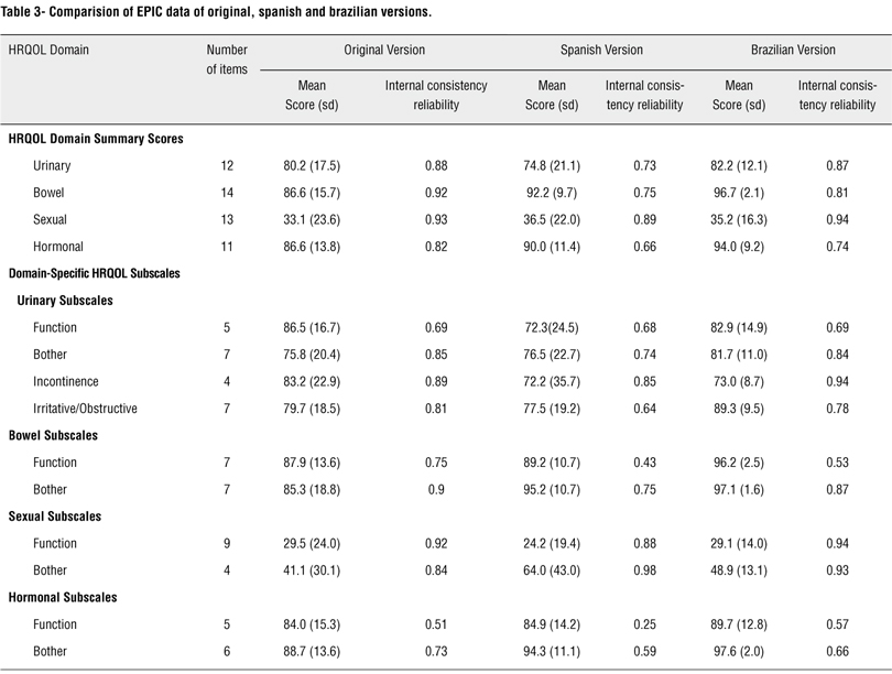 Conclusions: The Brazilian version of EPIC is reliable and valid, and is a useful tool to evaluate the impact of retropubic radical prostatectomy on quality of life of Brazilian patients with localized prostate cancer, in national and internationals studies.