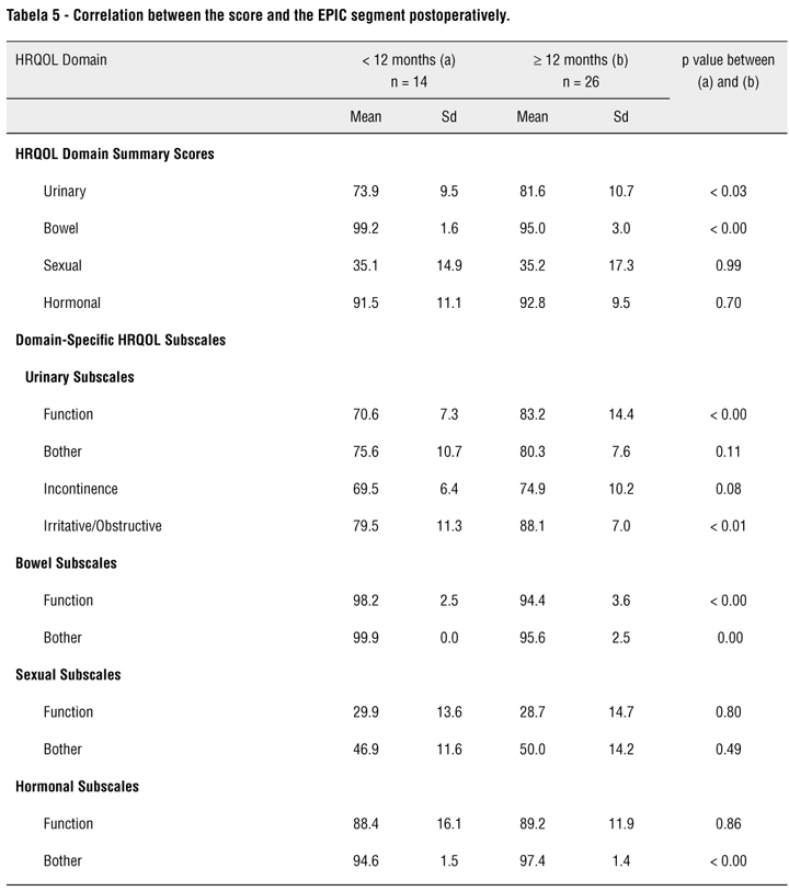 Post-operatory follow-up varied from 3 to 35 months, median 18.7 months, with minimal significant correlations of the following EPIC scores: “domain and urinary function”, “irritative/obstructive”, “domain, function and intestinal distress” and “hormonal distress”). It is observed that as the time passes, the scores tend to decrease (Table-5).