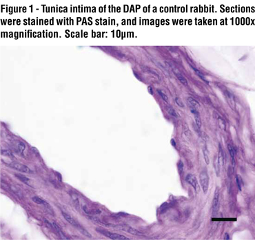 There was no significant change in smooth muscle cell density in the tunica media of the DAP between the groups. The ratio of nucleus per unit area was 0.007154 ± 0.001954 nuclei/μm² in CG and 0.004808 ± 0.002069 nuclei/μm² in the DG (P = 0.0855).