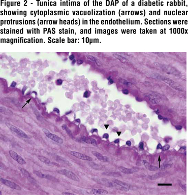 In this study, vascular remodeling associated with DM reached the tunica adventitia, changing the pattern of collagen fibers and reducing their thickness from that seen in the control group (orange birefringence), to thinner fibers (greenish birefringence). Changes in the pattern of collagen fibers have been previously demonstrated in the mesenteric artery of streptozotocin-induced diabetic rats (11). Rearrangement of collagen fibers in the extracellular matrix, in both the wall of the DAP and periarterial region, suggests that it occurred simultaneously to vascular hypertrophy associated with DM. In this study, we also found nuclear protrusions toward the lumen and endothelial cytoplasmic vacuolization in the tunica intima. Hadcock et al. (25) have also reported cytoplasmic vacuolization in endothelial cells in the aorta of alloxan-induced diabetic rabbits. In cells from the umbilical cord, this vacuolization has been shown to be correlated with an increase in mitochondrial area (28). Mitochondrial and nuclear changes are indicators of the reversible injury mechanism, vacuolar degeneration (29). Chemically induced hyperglycemia may also cause oxidative stress leading to cellular vacuolization (25).