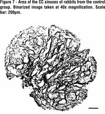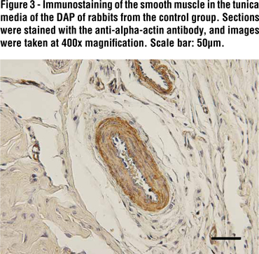 The immunostaining was used to estimate the smooth cell density and area of the DAP and CC sinuses. The avidin-biotin-peroxidase method was used to identify smooth muscle cells. Briefly, the sections were dewaxed in xylene, hydrated in a decreasing series of ethanol into water, and washed in phosphate buffered saline (PBS) for 5 minutes. Sections were then treated at room temperature with a 3% hydrogen peroxide solution in methanol to block endogenous peroxidase activity. Sections were then washed in PBS (3 x 5 minutes) and incubated with 1% goat serum in a moist chamber for 30 minutes at 37º C. Sections were then incubated with anti-alpha actin antibody (1:400, A-2547, Sigma-Aldrich Co, St Louis, MO, USA) in a moist chamber for 12 to 14 hours at 4º C. Negative controls were incubated with PBS instead of the primary antibody. Samples of a well-known tissue, with the antigen, were used for the positive controls, as previously described (4). Finally, the sections were washed in PBS (3 x 5 minutes) and incubated with the biotinylated secondary antibody (Sigma-Aldrich Co, St Louis, MO, USA) at 1:100 in a moist chamber for 30 minutes at room temperature, washed and incubated with the ABC complex (extravidin 1:100) for 30 minutes. The sections were then washed treated with a 393-diaminobenzidine tetrahydrochloride solution (Sigma-Aldrich Co, St Louis, MO, USA). The negative control was done by replacing the anti-smooth muscle a-actin antibody with PBS and no sign of staining was observed.