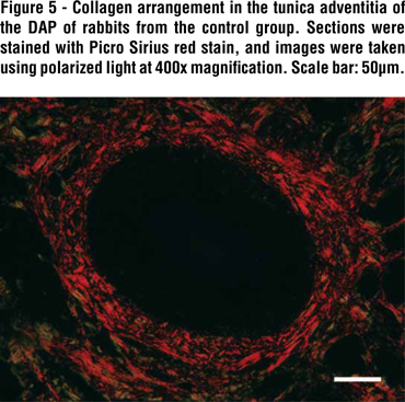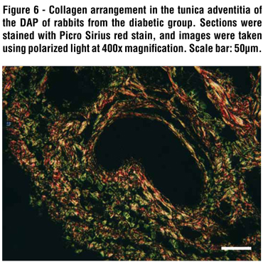 The collagen fibers of the tunica adventitia of the DAP were different between the control and diabetic groups. An orange birefringence and increased fiber thickness was observed in the control group. In the diabetic group, the birefringence was greenish and the fibers were thinner (Figures 5 and 6).