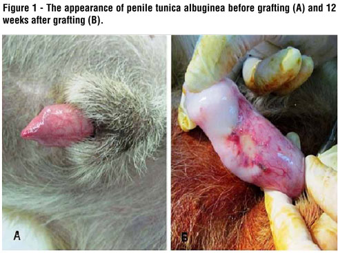 The operations were performed successfully in all of the animals. No complications related to surgery like infection or bleeding were seen during intra or postoperatively. The mean operation time was about 30 minutes. Full artificial erection was created without any chordee or deformity in the penis, and no leakage or bulging in the area of the grafts was seen in all of the dogs. The grafted amniotic membrane became similar to the surrounding tissue, and only the line of non-absorbable sutures discriminated the border between the graft and normal tissue (Figure-1).