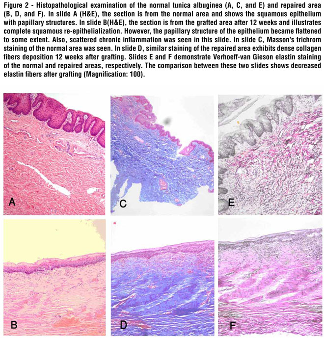 A study by Dr. Khodadoust (25) showed that the basement membrane of the amnion promotes the migration of the epithelial cells and reinstitutes adhesion between the basement membrane and new epithelial cells. In addition, Kim (26) showed that the stromal matrix of the amniotic membrane contains proteinase inhibitors that promote healing of the epithelium and reduces inflammation of the host tissue stroma. In one study, reverse transcription-polymerase chain reaction analysis showed that human amniotic epithelial cells are capable to express albumin, alpha-1-antitrypsin and other hepatocyte-related genes; therefore, the amniotic membrane has the potency to produce alfa-1-antitrypsin (27). Furthermore, in organ culture, the amnion also secreted alpha-1-antitrypsin. On the other hand, alfa-1-antitrypsin deficiency is likely to play a role in the pathogenesis of Peyronie's disease (8); as a result, the production of this material from the amniotic membrane can help in Peyronie’s disease treatment. A study by Del Carlo evaluated the role of matrix metalloproteinase in this abnormal scarring process. Matrix metalloproteinases are enzymes that are engaged in the remodeling of the extracellular matrix proteins; these remodeling enzymes are regulated by the tissue inhibitors of metalloproteinase. In the case of Peyronie’s disease, matrix metalloproteinases are downregulated, acting as a possible mechanism for the scarring process in the pathogenesis of Peyronie’s disease (7). In addition, immunohistochemistry studies performed on freshly prepared amniotic membrane confirmed that all the members of the tissue inhibitor of metalloproteinase (TIMP) family were present in the epithelial and mesenchymal cells and the compact layer of the amniotic stroma (24). So, the interaction between amniotic membrane TIMP and tunica albuginea must be studied further. The amniotic membrane contains several growth factors; it is avascular and has anti-inflammatory, anti-angiogenic, and anti-scarring effects. These properties make human amniotic membrane an ideal tissue graft for the surface reconstruction of different tissues. In contrast to the studies that have reported the anti-inflammatory effects of the amniotic membrane, we observed chronic inflammatory cells infiltration in the repaired area, although the inflammation decreased significantly in the dogs subjected to surgery after 12 weeks in comparison to the other group. Re-epithelialization occurred in all of the grafts in our study. Other studies have also demonstrated the great potential of re-epithelialization in amniotic membrane grafts. Although the dogs haven't Peyronie's disease, these results that showed tunica abuginea could be replaced by amniotic membrane are encouraging. Also longer follow-up in next studies is recommended for evaluation of late complications. It should be emphasized that although we hadn't any infection or unwanted reaction, allografts and synthetic materials carry the risk of tissue reaction and infection.