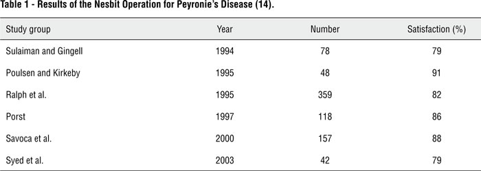 The tunica albuginea is a bilaminar structure throughout most of its circumference. It is composed of an outer longitudinal layer and an inner circular layer and the corpora are separated by an incompetent septum. Nevertheless, on the ventrum, the longitudinal layer of the tunica albuginea is absent and this potentially allows dorsal buckling more easily; this can explain why most patients with Peyronie’s disease demonstrate lesions dorsally. The etiology and risk factors of Peyronie's disease, however, are not known completely. Some factors such as β blockers, urethral instrumentation, certain human leukocyte antigen subtypes, TGF-β (6), downregulation of matrix metalloproteinase (7), reduction in α1-antitrypsin level (8), oxidative stress, and cytokine release may have a role in the pathogenesis of the disease. In most cases, there are two phases. The first one is the active phase and is usually associated with painful erections and changing deformity of the penis. The second quiescent phase is described by stabilization of the deformity and disappearance of painful erections. A wide spectrum of medical and surgical treatments has been suggested for Peyronie's disease but none of them is perfect. Vitamin E, colchicine, intralesional corticosteroids, and intralesional Verapamil are among the medications usually prescribed for the treatment. Some urologists prefer surgical correction for stable and mature disease. Reed Nesbit (9) corrected erectile deformities caused by congenital abnormalities by shortening the opposite side of the penis using plication or the excision of an ellipse of tunica albuginea. This technique was applied to Peyronie’s disease by Pryor and Fitzpatrick (10), who made use of the classical elliptical excision of the tunica opposite side of the plaque. Plication of the opposite aspect of the corpora cavernosa without excising the plaque was performed by Lue and Gholami (11). Also Yachia (12) explained the corporoplasty technique of longitudinal incision in the opposite side of the tunica albuginea and transverse closure. Modifications of the Nesbit operation (tunical incision with plication, plication alone, or combinations with elliptical excision) are commonly used by urologists. Be that as it may, in all of these techniques, shortening of the penis occurred and many of the patients did not accept this shortening. Austoni (13) showed high incidence of erectile dysfunction with plaque excision, when 20% of 418 patients developed postoperative erectile dysfunction. Penile prostheses are reserved for patients who also have an impaired erection or extensive disease. Several studies have shown that the satisfaction rates for the Nesbit Operation for Peyronie’s disease are variable (Table-1) (14). Also, the results of plication techniques in different studies are available (Table-2) (14). Due to high failure rates, erectile dysfunction, penile shortening, recurrent deformity, and dissatisfaction of the patients, some physicians have searched for materials that can substitute the lesions. Excision of the plaque and closing the corporotomy defect with tunica vaginalis, as an island based on a dartos fascial and cremasteric flap, was described by Das and Amar (4). Also, Buncke (15) performed an experimental animal study, in which the lesion was excised and the defect was substituted with temporalis fascia as a microvascular free flap.