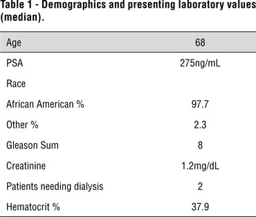 Our patient population was predominantly African American (N = 126) with only two Hispanic and one Middle Eastern patient in our cohort. The median age at presentation was 68 years (IQR 63,75) with a median total Gleason sum of 8 (IQR 7.75,9). The median PSA level at presentation was 275ng/mL (IQR 132,88). The median creatinine level and hematocrit were 1.2mg/dL (IQR 1,1.6) and 37.9 (IQR 32.2,41.4), respectively (Table-1). The median follow-up was 26.6 months. The patients in this cohort presented over the course of 10 years (1999-2009), however our median follow-up time for these individuals was only 26.6 months.