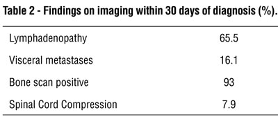 Screening CT scans were performed in 93 patients. Of those patients who underwent imaging at presentation 33/93 (35.5%) were found to have lymphadenopathy suspicious for metastasis, 15/93 (16.1%) had masses suspicious for visceral metastasis with the predominant site being the liver or lungs. Positive bone scans were identified in 118/127 (93%) patients with 10/127 (7.9%) exhibiting suspicion of cord compression (Table-2).
