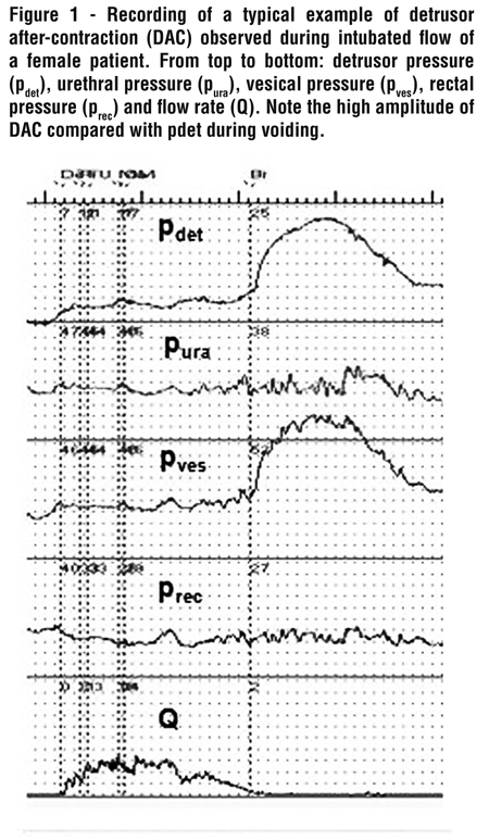 Detrusor after-contraction (DAC) is an urodynamic phenomenon (Figure-1) which definition (nothing in ICS reports) (1, 2) is not clear despite a recent proposal as “a detrusor pressure increase after flow ceases at the end of micturition” (3) although DAC is frequently observed when the bladder is close to empty (4). The first observation by Rehflish dates from 1897, and few studies have focused on DAC; strict definition, causes and significance of that phenomenon remain far from elucidation.