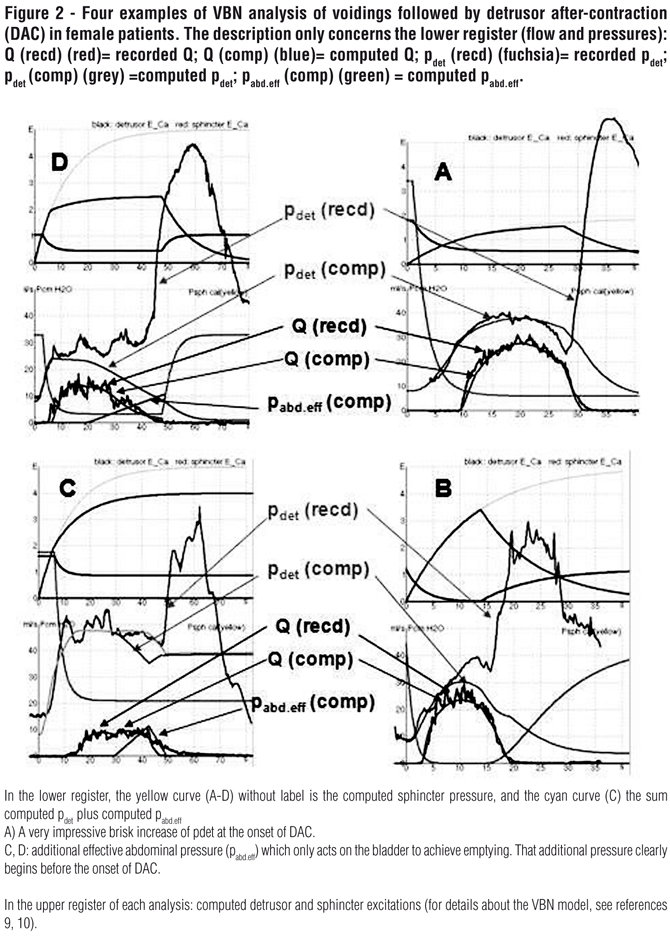 Aims: Detrusor after-contractions (DAC) are non-common in adults. Both definition (nothing in ICS reports) and significance (artefact, link with detrusor overactivity (DO) or bladder outlet obstruction (BOO)) remain discussed. Our purpose was to carry out an analysis of the urodynamic parameters during voidings with DAC and, using the VBN model, to simulate pathophysiological conditions able to explain both voiding phase and DAC.