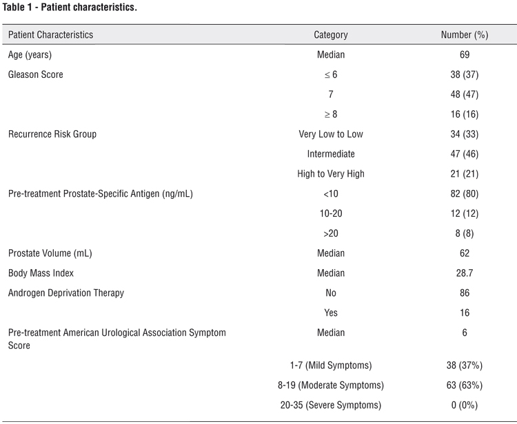 Results: Median follow-up was 14 months. Dosimetric goals were achieved in over 90% of cases. Three of 102 (3%) patients developed Grade 2 acute proctitis. No variables were significantly associated with Grade 2 acute proctitis. Seventeen of 102 (17%) patients developed Grade 2 acute urinary retention. American Urological Association (AUA) symptom score was the only variable significantly associated with Grade 2 acute urinary retention (p=0.04). There was no ≥ Grade 3 acute toxicity.