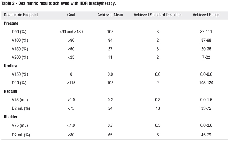 The clinical target volume (CTV) consisted of the prostate as defined by CT scan. The planning target volume (PTV) was the same as the CTV. The PTV was treated with two 1,350-1,400 cGy fractions. One fraction was delivered with each iridium-192 (Ir-192) implant, and the two implants were separated by 2-3 weeks. Prostate doses were recorded as the minimum dose that covered more than 90% of the prostate volume expressed as a percentage of the prescription dose (prostate D90). Prostate volumes were recorded as the fractional volume of the prostate that received 100% of the prescribed dose (prostate V100), 150% of the prescribed dose (prostate V150), and 200% of the prescribed dose (prostate V200). The urethral volume was recorded as the fractional volume of the urethra that received 150% of the prescribed dose (urethra V150). The urethral dose was the dose delivered to 10% of the urethral volume expressed as a percentage of the prescribed dose (urethra D10). The rectal volume was recorded as the fractional volume of the rectum that received 75% of the prescribed dose (rectum V75). Rectal doses were recorded as the maximum dose received by 2 mL of the rectum expressed as a percentage of the prescribed dose (rectal D2 mL). The bladder volume was recorded as the fractional volume of the bladder that received 75% of the prescribed dose (bladder V75). Bladder doses were expressed as the maximum dose received by 2 mL of the bladder expressed as a percentage of the prescribed dose (bladder D2 mL). Dosimetric goals are presented in Table-2. No androgen deprivation therapy (ADT) was given to HDR brachytherapy monotherapy patients, e.g., to down-size the prostate.