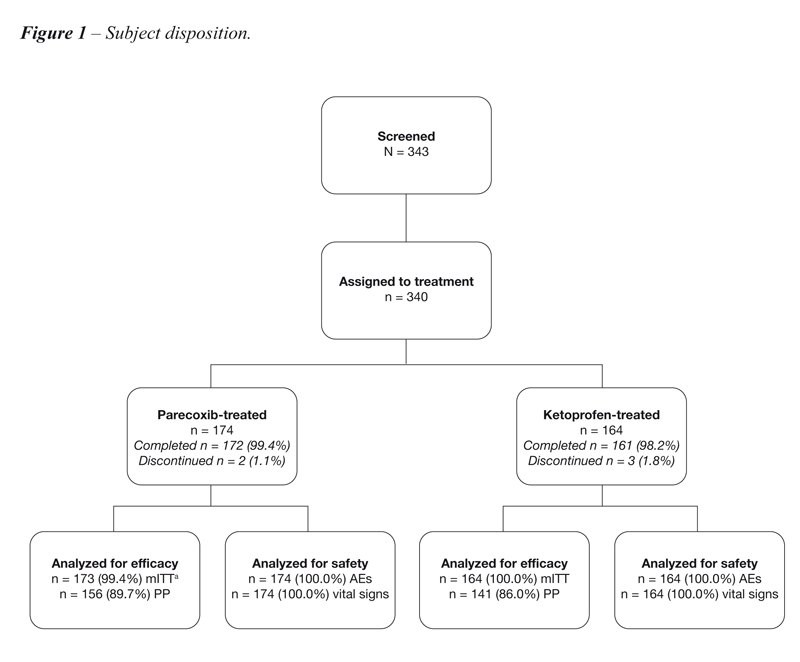Subjects were stratified by baseline PI into those with moderate or severe pain, according to the categorical PI scale. Using a computer-generated, block randomization schedule (block size 4), subjects were randomized 1:1 within each stratum and each study siteto receive parecoxib 40 mg I.V.. (n = 174) plus placebo or ketoprofen 100 mg I.V. (n = 164) plus placebo. To ensure both physicians and nurses were blinded to treatment, the randomization schedule was distributed in a sealed envelope to the pharmacist in charge of preparation and dispensing of the study drug. Subjects were evaluated at screening, initiation of drug infusion (time 0), and at 15, 30, 45, 60, 90 and 120 minutes after study drug administration; follow-up was conducted 24 hours after discharge. If required, rescue medication (I.V. morphine) was allowed.