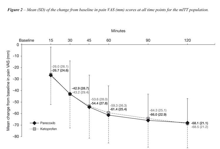 Results: Baseline demographics were similar. The mean (SD) mPID30 min was 33.84 (24.61) and 35.16 (26.01) for parecoxib and ketoprofen, respectively. For treatment difference (parecoxib-ketoprofen) the lower bound of the 95% CI was 6.53. The mean change from baseline in VAS 30 minutes after study medication was ~43 mm; AEs were comparable between treatments.