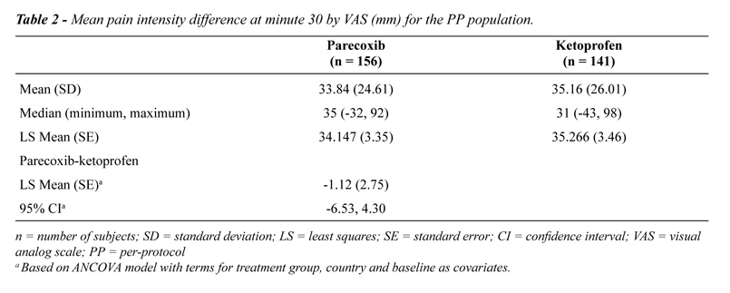 The non-inferiority criterion was met for the primary efficacy endpoint, the mPID30min. The 95% CI of the treatment difference (parecoxib - ketoprofen) was -6.53; 4.30 and it excluded the non-inferiority margin of -10 mm (Table-2). There were no significant differences observed between the treatment groups with regard to the secondary efficacy endpoints.
