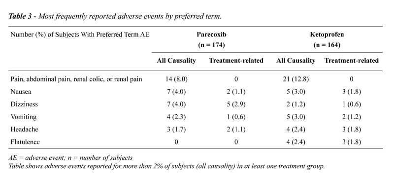 Pain (preferred terms “pain”, “abdominal pain”, “renal colic” and “renal pain”) was the most frequently reported AE, experienced by 8% of subjects in the parecoxib group and 12.8% of subjects in the ketoprofen group (Table-3); again, none of these pain episodes was considered to be treatment-related. Although nausea was the second most frequently reported AE only two subjects in the parecoxib group and three subjects in the ketoprofen group experienced nausea that was considered to be treatment-related.