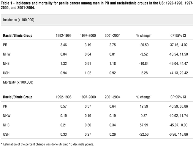 In PR, a total of 587 cases of penile cancer were diagnosed between 1992-2004. Comparing the period of 2001-04 vs. 1992-1996, penile cancer incidence decreased for all racial/ethnic groups. Increasing percent change in mortality of penile cancer was only observed among NHB and PR men. A slightly increase percent change was observed among NWH (Table-1).