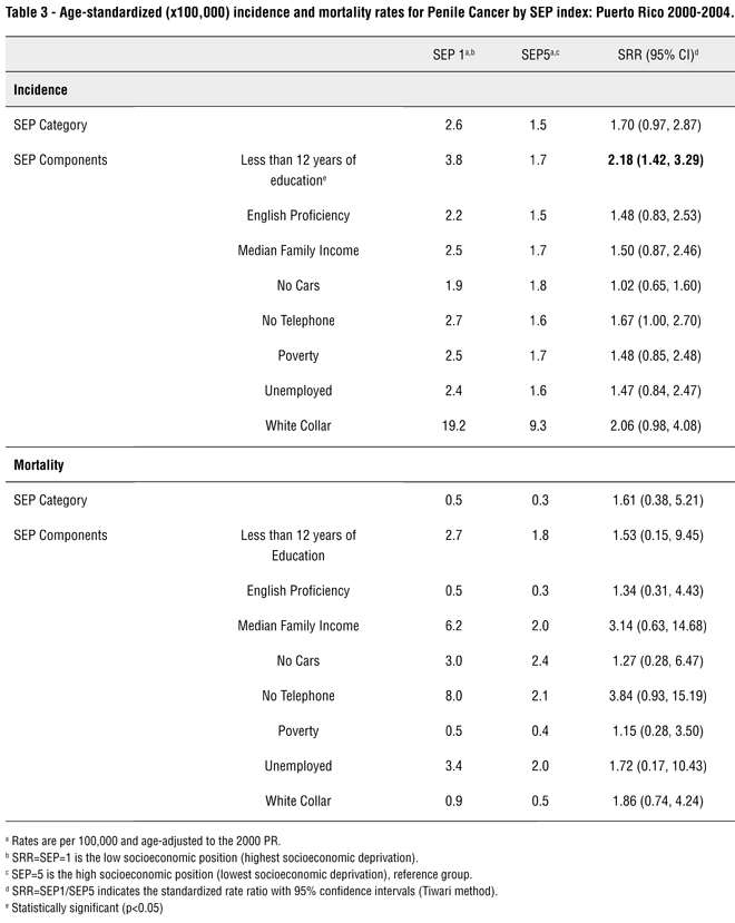 Purpose: This study compares incidence and mortality of penile cancer in Puerto Rico (PR) with other racial/ethnic groups in the United States (US) and evaluates the extent in which socioeconomic position index (SEP) or its components influence incidence and mortality in PR. Materials and Methods. Age-standardized rates were calculated for incidence and mortality based on data from the PR Cancer Registry and the US National Cancer Institute’s Surveillance, Epidemiology and End Results program, using the direct method. Results. PR men had approximately 3-fold higher incidence of penile cancer as compared to non-Hispanic white (Standardized rate ratio [SRR]: 3.33; 95%CI=2.80-3.95). A higher incidence of penile cancer was also reported in PR men as compared to non-Hispanic blacks and Hispanics men. Mortality from penile cancer was also higher for PR men as compared to all other ethnic/racial groups. PR men in the lowest SEP index had 70% higher incidence of penile cancer as compared with those PR men in the highest SEP index. However, the association was marginally significant (SRR: 1.70; 95%CI=0.97, 2.87). Only low educational attainment was statistically associated with higher penile cancer incidence (SRR: 2.18; 95%CI=1.42-3.29). Conclusions. Although penile cancer is relatively uncommon, our results support significant disparities in the incidence and mortality rates among men in PR. Low educational attainment might influence the high incidence of penile cancer among PR men. Further studies are strongly recommended to explore these disparities.