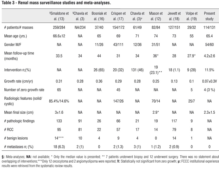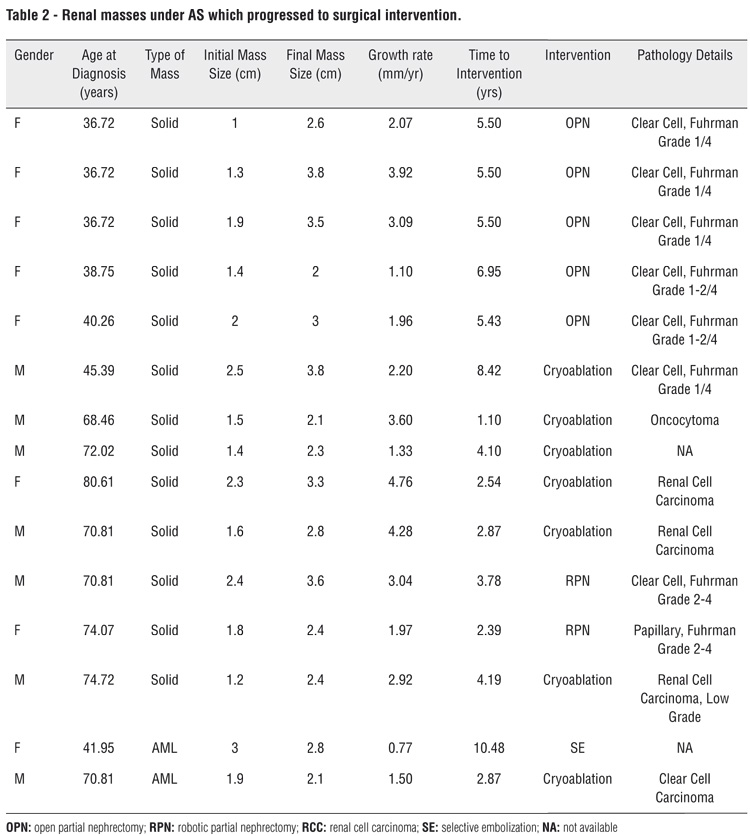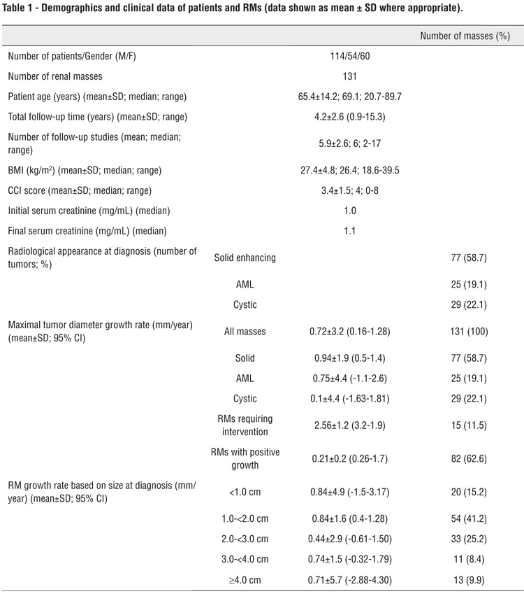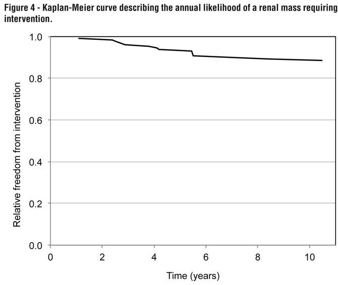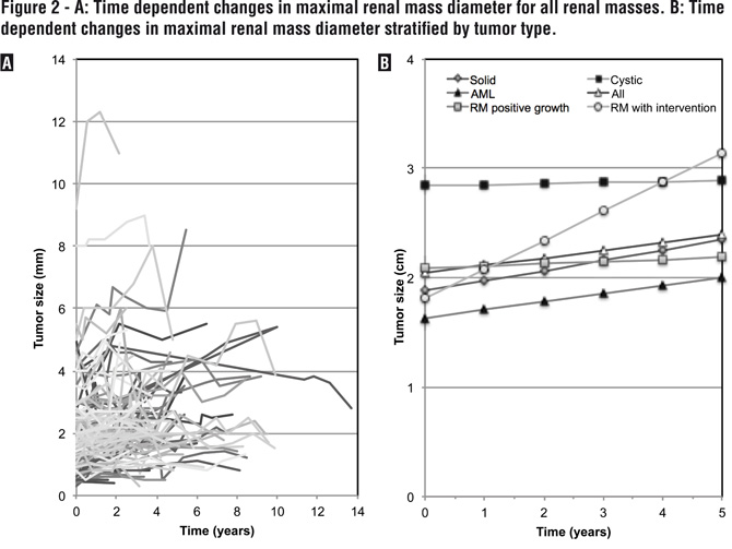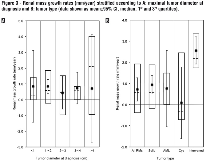 RESULTS: 131 RMs in 114 patients were included. Median age, Charlson Comorbidity Index score and mean follow-up were 69.1 years, 4.0 and 4.2±2.6 years, respectively. Maximal tumor diameter (MTD) at diagnosis was 2.1±1.3 cm. 49 RMs exhibited negative or zero net growth. Mean MTD growth rate for all RMs was 0.72±3.2 (95% CI: 0.16-1.28) mm/year. When stratified by MTD at diagnosis, mean RM growth rates were 0.84, 0.84, 0.44, 0.74 and 0.71 mm/year for RMs <1 cm, 1-<2cm, 2-<3cm, 3-<4cm and ≥4cm, respectively (p<0.01). The 5 and 10-year freedom from intervention rates were 93.1% and 88.5%, respectively. There was a single case of suspected metastases, but no deaths related to kidney cancer.