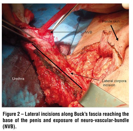 After positioning of the patient and disinfection of surgical area, a 1 meter iodine embalmed tampon is introduced in the rectum used as guide during construction of the neovaginal space. A 16 Fr. urethral catheter is placed and scrotal incision area is marked as shown in Figure-1. Superficial dissection of scrotal skin is performed and the collected tissue conserved in saline medium in case of using it as free skin flap. Bilateral orchiectomy is done followed by closure of the external inguinal ring. The base of the penis is laterally dissected apart from scrotal fat, which will be used to build the labia majora bilaterally. Penile skin is blunt dissected from the body after circular dissection about 0.5 cm from sulcus coronarius, preserving subcutaneous tissue as much as possible. After identification of the neurovascular bundle (NVB), lateral cauterization and incision along Buck’s fascia from the penis base up to sulcus coronarius is performed (Figure-2). The NVB is ventrally dissected and separated from the corpora cavernosa following dismembering of the urethra from the corpora. The corpora are dissected to their base, separated and resected after ligature at the level of the crura.