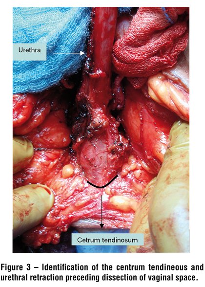 After positioning of lateral retractors exposing the bulbar urethra, the centrum tendineum is identified and dissected reaching Denovillier’s fascia. The urethra is carefully pulled upwards, retracting its bulbar portion, facilitating further dissection (Figure-3). The bladder is emptied to avoid possible lesions. Blunt dissection of neovaginal space with a Simon's retractor is performed. Preparation is terminated when a depth over 14 cm is achieved. Identification of right anatomic layers, avoiding injuries of the urethra, prostate, seminal vesicles, sphincter and bladder is essential. After its distal closure, the phallic cylinder is stabilized with a vaginal stent (inflatable silicone prosthesis-ColoplastTM) and placed inside the cavity. The position of the clitoris and urethra are defined and a longitudinal incision is made in order to exteriorise both segments. Glans-derived sensate clitoroplasty is then performed.