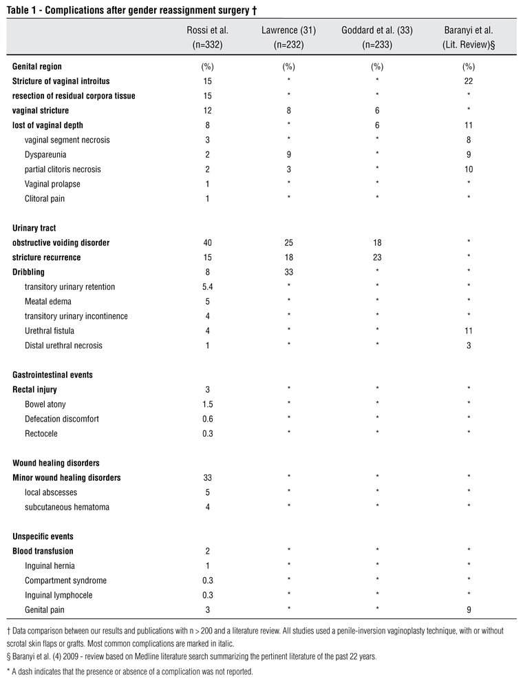 Table-1 lists the adverse events found in the last 13 years of gender reassignment surgery in our clinic. A review of the literature publications with a number of subjects greater than 200 was carried out. Few references were found, especially regarding overall complication rates. These main studies are listed bellow, and a comparison between their findings and our actual data was made. Surprisingly there was a great lack of information in the literature, supporting our decision on presenting the results.