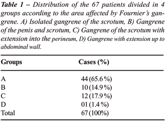 and in 13 (19.3%) there has been a debridement of the scrotum and the