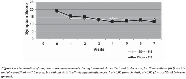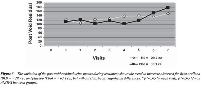 0.20) (Table-2). COMMENTS There is not enough evidence to accept phytotherapy as an alternative to the urologist to treat patients presenting LUTS associated to BPH. The US National Institute of Health (NIH) has been conducting studies to determine the role of these agents even though in Germany and France some plant extracts have been registered to treat those patients (20). The WHO does not recommend phytotherapy as an appropriate treatment, mainly because there is little information available on well designed clinical trials utilizing placebo as a control. There are no studies with adequate sample size and segments to define the efficacy and tolerability in the long term of those plant extracts (21,22). Even though the US Department of Health and Human Services manifests that phytotherapeutic agents and other dietetic supplements are used in the whole world as treatment for patients with LUTS associated to BPH, the mechanism of action, effectiveness and security of such agents have not been well documented in multicentric clinical trials (6). One of the last publications shows the efficacy of a plant extract in the treatment of patients presenting LUTS associated to BPH, as equivalent to tamsulosin. This clinical trial was performed in 704 patients, from who 354 received Tamsulosin 0.4 mg/day and 350 Saw Palmetto berry (SPBE) 320 mg/day for a period of 12 months. The results show a decrease in the symptom score of 4.4 scores for both groups and an increase in the Qmax of 1.8mL/sec for those that received SPBE and 1.9 mL/sec for the ones that received Tamsulosin. The conclusions of this study show that SPBE and Tamsulosin are equivalent. In our opinion and coinciding with the editorial comments this conclusion is controversial, due to the fact that there is not a previous study with the same design that compares SPBE with Pbo. Under this circumstance it is not possible to differentiate the results of this study with that of Pbo (23). In relation to the mean symptom score, the patients from the BO had a decrease of 5.5 scores and those from the Pbo group of 7.5 scores, with a mean delta variation of symptom score for BO of - 0.79 ± 1.87 and Pbo - 1.07 ± 1.49 (p = 0.33) reaffirming the trend to decrease the symptom score in both groups (Figure-1). The decrease of the score in percentage showed an effect for BO equivalent to 54.4% and for the Pbo group to 55.9% (p = 0.89). The other variables showed the same trend and we could not find a coherent relation in the results; for example, the Qmax increased in both groups showing some benefit, but the post void residual urine had also increased showing a deleterious obstructive effect, those contradictory results reflect the absence of significant differences between interventions. Various clinical trials have demonstrated that adrenergic alpha blockers such as terazosin, doxazosin and tamsulosin improve LUTS associated to BPH (24-29). Those evidences document the effect of the efficacy of alpha-adrenergic blocking agents in the treatment of patients presenting LUTS associated to BPH, information that is reinforced with the publications where it is revealed that surgeries related to BPH have decreased (30). We hope that BO has the same effects, as a product of our observation in the daily clinical practice, but in the light of these results, it is shown that there is no evidence that BO offers any therapeutic advantage to those patients. Thus, we emphasize that this product should not be used as phytotherapeutic in patients presenting moderate LUTS associated to BPH. CONCLUSION Bixa orellana compared with placebo in patients presenting moderate LUTS associated to BPH showed similar results in relation to symptom score, Qmax and post void residual urine. ACKNOWLEDGMENTS Doctors Raul Medina, Weymar Melgarejo and Alfonso Del Castillo, staff of the Section of Urology, National Hospital Cayetano Heredia, collaborated with the study. CONFLICT OF INTEREST Study sponsored by Galenica Pharmaceuticals, Inc. REFERENCES