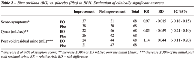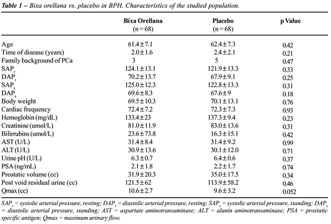 pepo seed and purple coneflower root (9,10). MATERIALS AND METHODS A double-blind randomized placebo-controlled study was conducted from November 2002 to August 2004 in the Urology Service of the National Hospital Cayetano Heredia, Lima - Peru, to evaluate the efficacy and safety of BO in patients with BPH that presented moderate LUTS. The study counted on the approval of the Peruvian University Cayetano Heredia (UPCH) ethics committee, and a written informed consent was signed. The study was designed to have duration of 12 months with a temporary cut, at the time the last patient enrolled ended 6 months of treatment. To be able to enroll the study the patients should fulfill the following inclusion criteria: to have between 50 and 70 years of age, good physical and mental condition judging by his clinical history, physical exams and laboratory data. Experience at least 2 obstructive urinary symptoms, have a maximum urinary flow (Qmax) in average from 5 to 15 mL/sec, a post void residual urine inferior to 250 mL, an increased volume of the prostatic gland according to digital rectal examination, as well as prostatic specific antigen (PSA) less than 10 ng/mL. They should also fulfill the following criteria of exclusion: presence of dysuria or hematuria, abnormalities in laboratory determinations, have a maximum urinary flow > 15 mL/sec, a prostatic gland with reduced volume at digital rectal examination, PSA > 10 ng/mL, allergies, drug abuse, chronic use of medicine with antiandrogenic properties, history of diseases that predispose to urethral stenosis, urinary infection, invasive interventions for BPH treatment, evidence of prostate cancer, history of intermittent catheterization and neurogenic bladder. We have interviewed 1,478 patients presenting moderate LUTS associated to BPH, from who we selected 136 patients to fulfill the criteria for inclusion and exclusion. Together with the reading of the informed consent, we explained about the study and after they accepted the conditions, they signed in. A routine clinical history and physical exam was performed and they all answered the symptom score questionnaire in writing. Basic hematologic, renal function, hepatic function, biochemistry and urine analysis were performed. In addition, a transrectal echography of the prostate, uroflowmetry and post void residual urine measurement were performed. Selected patients were assigned randomly in groups of four and for such effect, 17 groups were chosen (17 x 4), each group was randomly chosen exchanging for four assignations, 2 for placebo and 2 for Bixa orellana. This procedure allowed balancing the groups, in a way that 68 patients received Bixa orellana and 68 placebo. According to the randomization it was administered orally, Bixa orellana one capsule of 250 mg or placebo, 3 times a day. The capsules of Bixa orellana were prepared in the following way; one ton of leaves of the plant of BO was gathered, the leaves were dried at environment temperature for 30 days, the BO leaves were lyophilized obtaining 10 bags of 1 Kg, they were further encapsulated by a pharmaceutical laboratory, 250 mg for each capsule. The capsules of placebo were carefully prepared by the same laboratory so that they have the similar form, color, smell and flavor of Bixa orellana. Evaluations started with patient selection visits (V0), followed by a treatment visit one month after (V1) and the following ones were every two months until they reached visit 7 (V7) to the 12 months of study. In every visit, the patient answered the AUA symptom score questionnaire. A Qmax measure was also performed with the Uro Flor Monitor 6030 as well as the post void residual urine with the Bladder Scan 3000. After 6 and 12 months of treatment an echographic control of the prostatic volume was repeated, performed with a 6.5 MH transducer. The physical exam was performed and it included measurement of vital signs and digital rectal examination of the prostate. The effects reported spontaneously were considered as adverse such as those reported by the patient when he was asked if he had presented any health problem since his last visit The results of the LUTS, Qmax and post void residual urine tests were compared by 2-way ANOVA, aiming at demonstrating the variations between means of each visit within each group and among groups. In the same way the measurements deltas within each group and between both groups in each visit by t-test were compared. Calculation of such deltas were performed aiming at evaluating more precisely if there was an improve or deterioration of the variables studied. Afterwards, the mean delta of all the visits for each group was estimated and compared to the means between both by the t-test. Positive deltas meant an increase in the values of the data of the variables and negative delta a decrease in the values of the data of the variables. The improvement of the patients was defined as the patients that presented an improvement ≥ 30% or ≥ 3 mL/sec in relation to the initial Qmax, decrease ≥ 30% in the total score of symptoms and decrease ≤ 30% of the initial post void residual urine (18,19). The relative risk (RR) was calculated as well as the risk differences (RD) to evaluate the clinical response, assessing the improvement of the symptoms, of the Qmax and of the post void residual urine. The size of the sample was calculated to determine advantages in the order of 30% of improvement in the symptoms score, for such effect both proportions were compared, bearing in mind the probability to make a mistake type I (α) of 0.05 and mistake type II (β) of 20%, with a power of 80% resulting in a sample size of 136. It was considered as statistically significant a p ≤ 0.05. Data were analyzed in SPSS vs. 7.5 y STATA v.7. RESULTS From