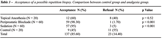 = 0.4), compared to 100% of those submitted to periprostatic anesthesia