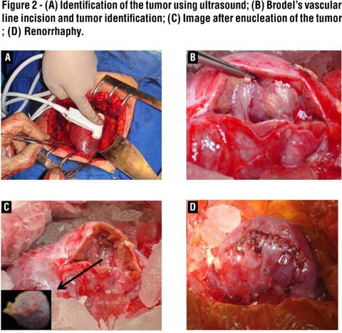 Renal intraparenchymal (endophytic) tumors represent greater technical difficulties for localization and resection and may increase the chances of complications (8). Partial nephrectomy and/or enucleation represent 30% of the surgical procedures used for renal tumors, with long-term survival similar to radical nephrectomy for the initial stages, with cancer-specific and overall survival of 98% and 97% respectively (1,4,10). For tumors <4cm, there is no need to remove any additional surgical margin for optimal cancer control. The use of intraoperative ultrasound facilitates the precise identification of the lesion(s), its relation with intra-renal structures and the proximity of the major kidney vessels (9).