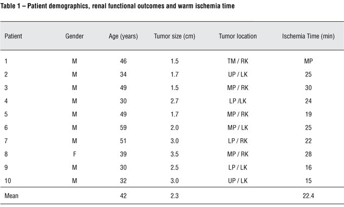 Ten patients were evaluated. The mean age was 42 yrs (30-59), and nine were male. The mean tumor size was 2.3 cm (1.5–3.5), compared with 3.5 + 2.4 cm of all partial nephrectomies. Mean warm ischemia time was 22.4 min (15-30) (Table 1). The mean pre-operative serum creatinine was 0.88 mg/dl, and the post-operative value was 0.94 mg/dl, measured two weeks after surgery.