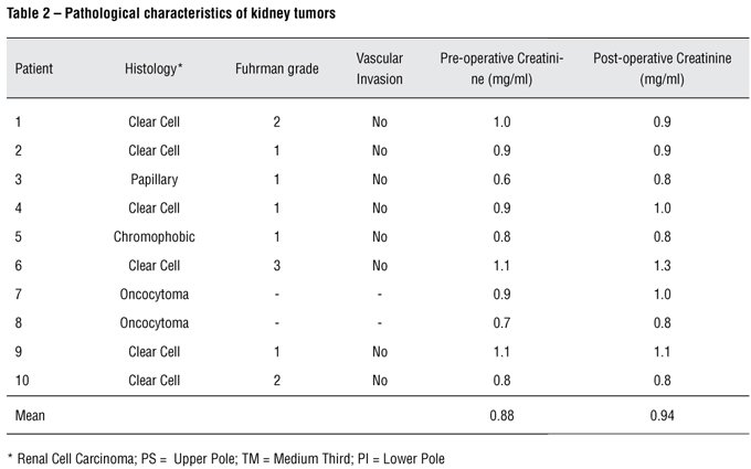 On the pathological analysis, two lesions had benign etiology (oncocytoma), and among the renal cell carcinomas, six were of clear cells, one papillary, and one chromophobic. The majority of the lesions were of low Fuhrman grade, and no positive surgical margin has been observed in this series (Table 2).
