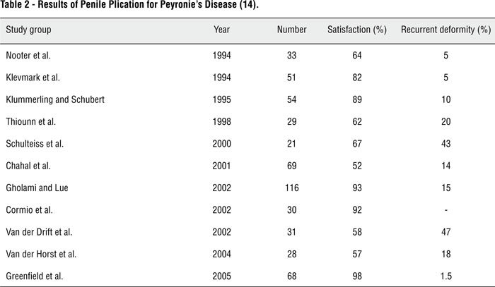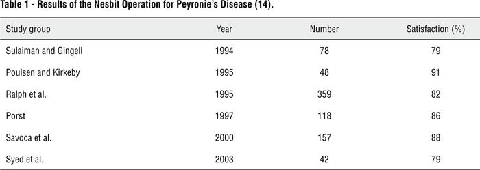 The tunica albuginea is a bilaminar structure throughout most of its circumference. It is composed of an outer longitudinal layer and an inner circular layer and the corpora are separated by an incompetent septum. Nevertheless, on the ventrum, the longitudinal layer of the tunica albuginea is absent and this potentially allows dorsal buckling more easily; this can explain why most patients with Peyronie’s disease demonstrate lesions dorsally. The etiology and risk factors of Peyronie's disease, however, are not known completely. Some factors such as β blockers, urethral instrumentation, certain human leukocyte antigen subtypes, TGF-β (6), downregulation of matrix metalloproteinase (7), reduction in α1-antitrypsin level (8), oxidative stress, and cytokine release may have a role in the pathogenesis of the disease. In most cases, there are two phases. The first one is the active phase and is usually associated with painful erections and changing deformity of the penis. The second quiescent phase is described by stabilization of the deformity and disappearance of painful erections. A wide spectrum of medical and surgical treatments has been suggested for Peyronie's disease but none of them is perfect. Vitamin E, colchicine, intralesional corticosteroids, and intralesional Verapamil are among the medications usually prescribed for the treatment. Some urologists prefer surgical correction for stable and mature disease. Reed Nesbit (9) corrected erectile deformities caused by congenital abnormalities by shortening the opposite side of the penis using plication or the excision of an ellipse of tunica albuginea. This technique was applied to Peyronie’s disease by Pryor and Fitzpatrick (10), who made use of the classical elliptical excision of the tunica opposite side of the plaque. Plication of the opposite aspect of the corpora cavernosa without excising the plaque was performed by Lue and Gholami (11). Also Yachia (12) explained the corporoplasty technique of longitudinal incision in the opposite side of the tunica albuginea and transverse closure. Modifications of the Nesbit operation (tunical incision with plication, plication alone, or combinations with elliptical excision) are commonly used by urologists. Be that as it may, in all of these techniques, shortening of the penis occurred and many of the patients did not accept this shortening. Austoni (13) showed high incidence of erectile dysfunction with plaque excision, when 20% of 418 patients developed postoperative erectile dysfunction. Penile prostheses are reserved for patients who also have an impaired erection or extensive disease. Several studies have shown that the satisfaction rates for the Nesbit Operation for Peyronie’s disease are variable (Table-1) (14). Also, the results of plication techniques in different studies are available (Table-2) (14). Due to high failure rates, erectile dysfunction, penile shortening, recurrent deformity, and dissatisfaction of the patients, some physicians have searched for materials that can substitute the lesions. Excision of the plaque and closing the corporotomy defect with tunica vaginalis, as an island based on a dartos fascial and cremasteric flap, was described by Das and Amar (4). Also, Buncke (15) performed an experimental animal study, in which the lesion was excised and the defect was substituted with temporalis fascia as a microvascular free flap.