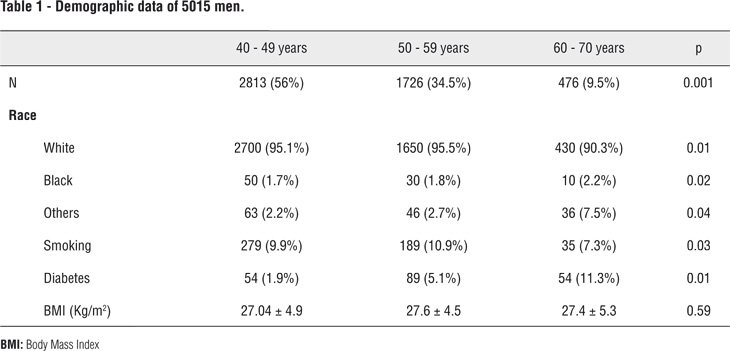 Of the total number of 5315 patients evaluated in this urological examination program from January to December 2011, 300 were excluded due to any one of the exclusion criteria listed above. Thus, a total of 5015 men with an average age of 49.0 +/- 4.0 years completed the study. Out of 5015 men, 3880 (77.3%) were white and only 90 (1.7%) were black. The overall prevalence of diabetes mellitus in our population was 3.9% (197/5015). These demographic data are presented in Table-1.