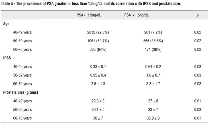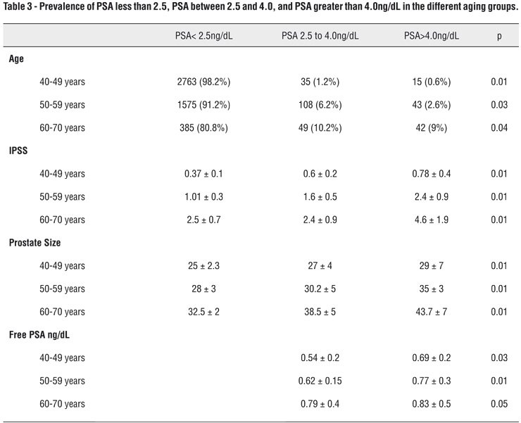 Results: A total of 5015 men with an average age of 49.0 years completed the study. Most men were white and asymptomatic. The PSA in the three different aging groups were 0.9 ± 0.7ng/dL for men between 40 and 50; 1.2 ± 0.5ng/dL for men between 50 and 60; and 1.7 ± 1.5ng/dL for men greater than 60 years (p=0.001). A total of 192 men had PSA between 2.5 and 4ng/ml. From these men 130 were undergone to prostate biopsy. The predictive positive value of biopsy was 25% (32/130). In the same way, 100 patients had PSA >4ng/mL. From these men, 80 were undergone to prostate biopsy. In this group, the predictive positive value of biopsy was 40% (32/100). The Gleason score was 6 in 19 men (60%), 7 in 10 men (31%) and 8 in 3 men (9%).