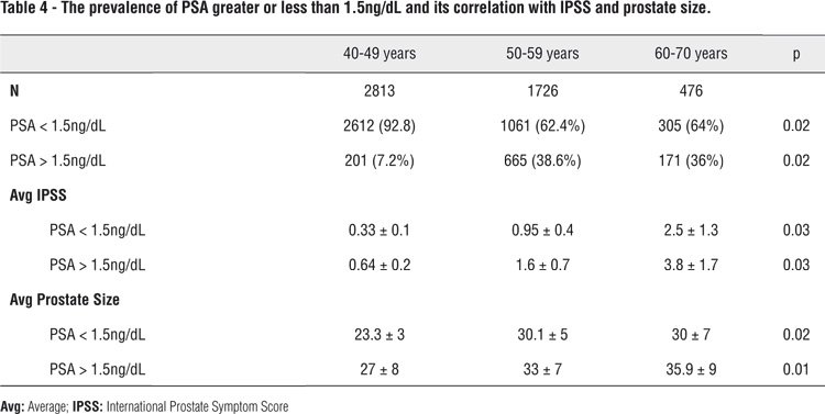 Materials and Methods: This is a cross sectional study performed with men between 40 and 70 years undergone to check-up. All men were undergone to urological evaluation, digital rectal examination, prostate-specific antigen, and ultrasonography The exclusion criteria were men who used testosterone in the last six months, or who were using 5 alpha-reductase inhibitors.